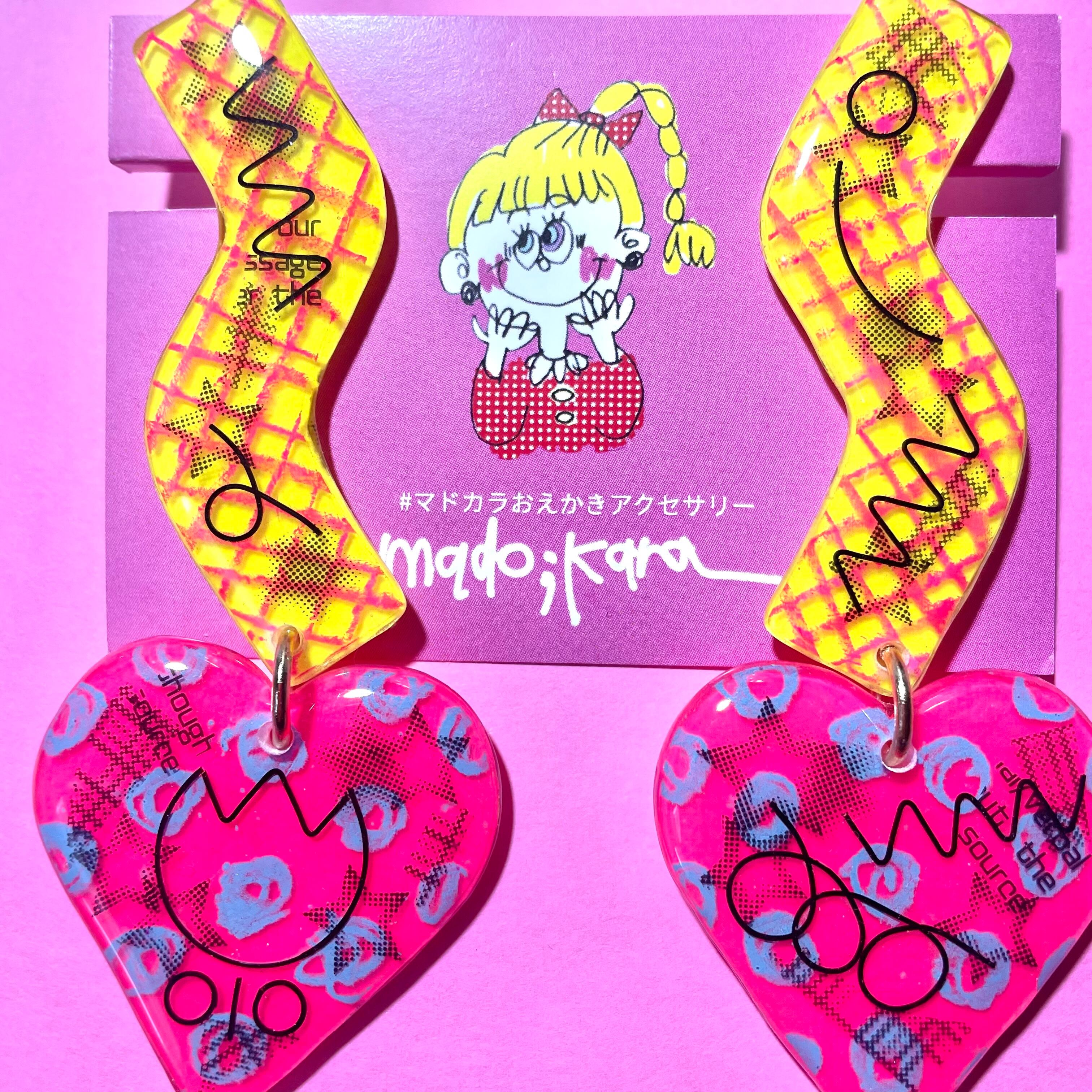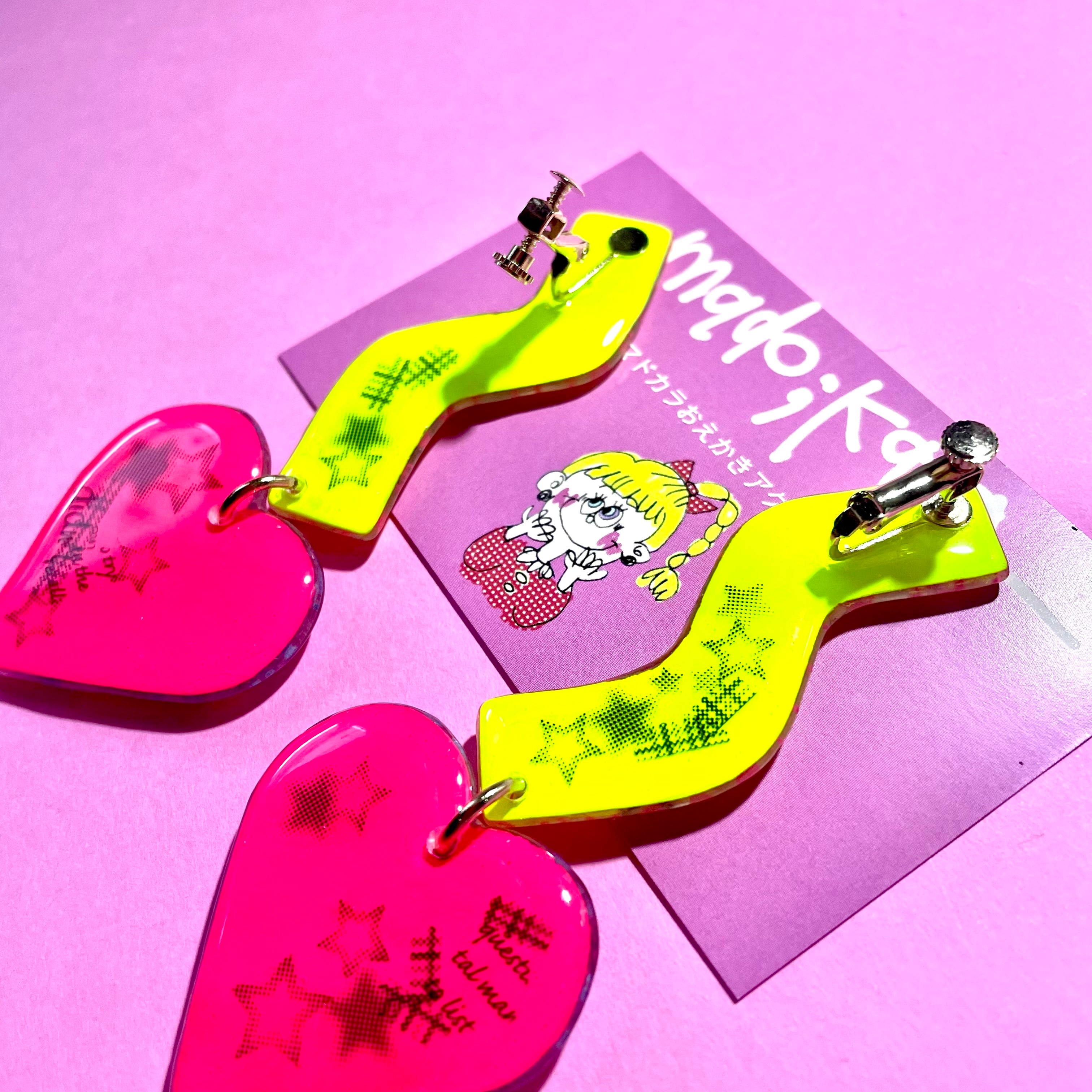 〜 + ♡ うねうねとハートのイヤリング(ネオンイエロー / ネオンピンク)